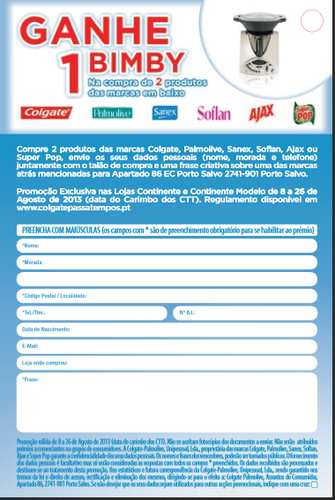 Compre 2 produtos das marcas Colgate, Palmolive, Sanex,Soflan, Ajax ou Super Pop, envie os seus dados pessoais (nome, morada e telefone) juntamente com o talão de compra e uma frase sobre uma das marcas atrás mencionadas para Apartado 86 EC Porto Salvo 2741 – 901 Porto Salvo.