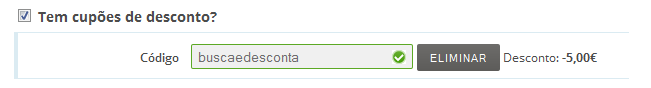 R.: No passo 2 da compra, onde pergunta se temos algum cupão de desconto, coloquem o código buscaedesconta. Como podem ver abaixo, o cupão é assumido automaticamente bem como o desconto de 5,00€.